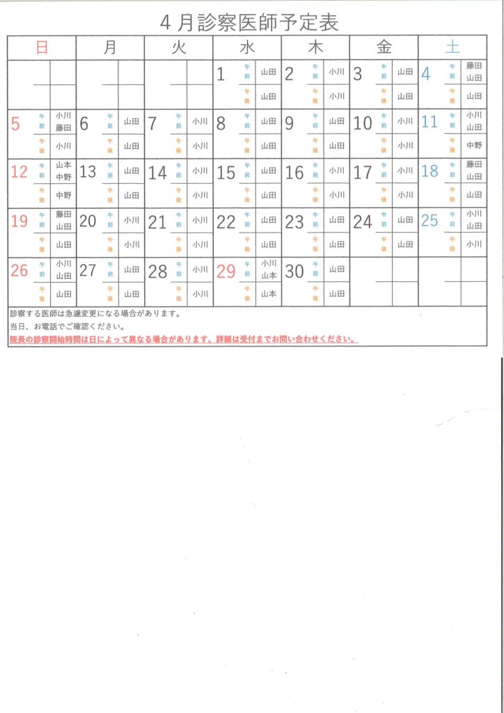 4月の診察医師予定表